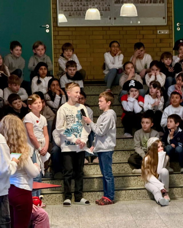Bevor sich die Schulleiterin Frau Rinsche, die OGS-Leitung Frau Stöver und Bürgermeister Dr. Leon zu einem intensiven Austausch über die Zukunft der Schule zurückzogen, verabschiedeten sich die Kinder mit einem närrischen Karnevalstanz.