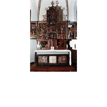 During rebuilding in 1875, the late Gothic chancel with its 5/8 pattern remained intact. Groined arches. Circa 1500. Features: Flanders carved altar circa 1530, Antwerp carvings with painted wings, early Netherlands renaissance. Bells date from 1479 and 1478. *