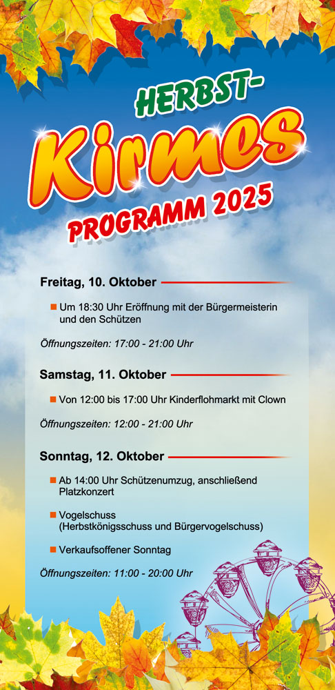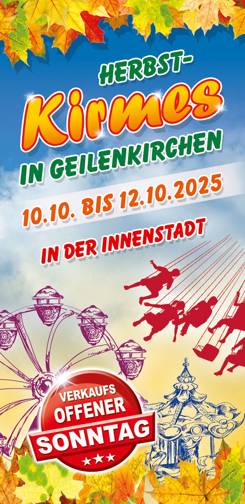 Vom 10. bis 12. Oktober 2025 lädt die Stadt Geilenkirchen gemeinsam mit den drei Schützenbruderschaften der Innenstadt herzlich zur Herbstkirmes für die ganze Familie ein. Auf dem Marktplatz und in der Innenstadt erwarten die Besucherinnen und Besucher traditionelle Fahrgeschäfte, beliebte Spielstände wie Entenangeln oder Schießwagen sowie zahlreiche Verkaufsstände. Für das leibliche Wohl ist ebenfalls bestens gesorgt: Ein vielfältiges kulinarisches Angebot mit Imbiss- und Getränkeständen garantiert Genuss und Abwechslung.