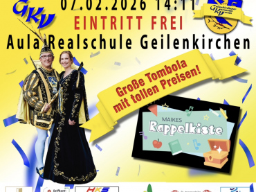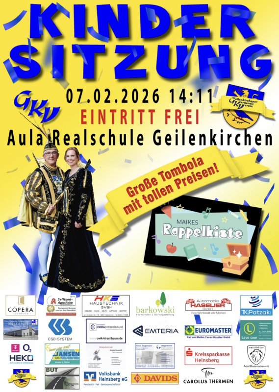 Kindersitzung vom GKV-Geilenkirchener Karnevalsverein in der Aula der Realschule Geilenkirchen bei freiem Eintritt! Große Tombola, tolles Kinderprogramm und Auftritt und Mitmachprogramm mit Maike Toussaint - bekannt aus Maikes Rappelkiste, aus Hörbüchern, von Kinderliedern und Kinderbüchern. Begleitet wird sie von ihrer Tochter Lucy, bekannt aus THE VOICE KIDS. Zusätzlich gibt es Tanzaufführungen des GKV.