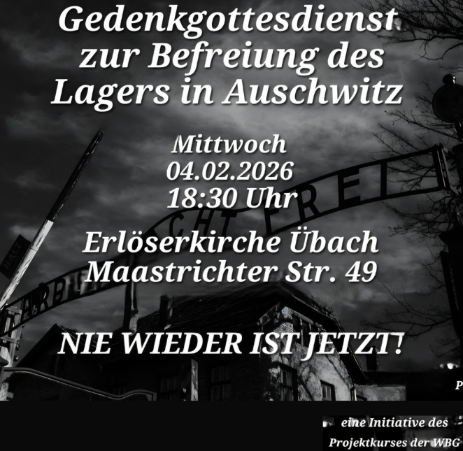 Gemeinsam mit der evangelischen Kirchengemeinde Übach-Palenberg gestalten sie einen Gedenkgottesdienst zur Befreiung des Konzentrationslagers Auschwitz, der unter dem Motto „Nie wieder ist jetzt“ steht.
