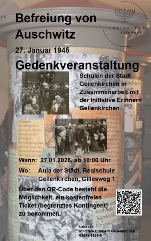 Anlässlich des Jahrestages der Befreiung des Konzentrations- und Vernichtungslagers Auschwitz am 27. Januar 1945 laden die Schulen der Stadt Geilenkirchen in Zusammenarbeit mit der Initiative Erinnern Geilenkirchen zu einer Gedenkveranstaltung ein.