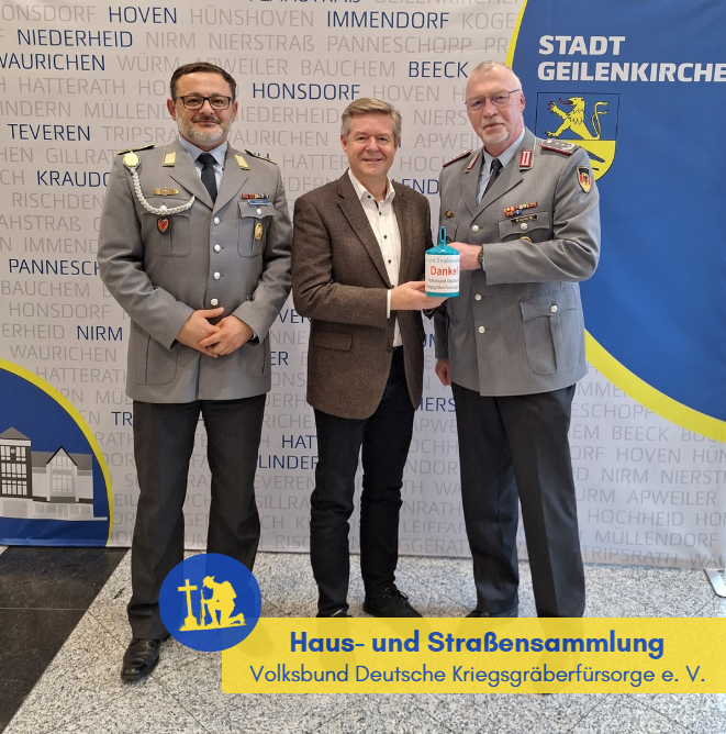 Zum Auftakt der diesjährigen Sammlung übergaben der Standortälteste des Zentrums für Verifikationsaufgaben der Bundeswehr, Oberst Schulte, und Hauptfeldwebel Yilderim Bürgermeister Dr. Leon eine Spendendose. So erhalten auch die Mitarbeitenden der Stadtverwaltung die Möglichkeit, die Arbeit des Volksbunds zu unterstützen.