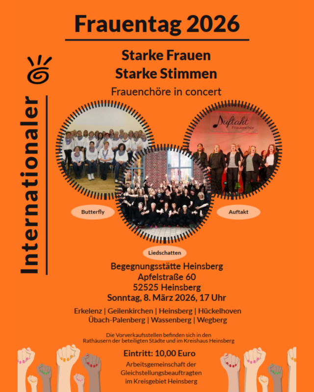 Anlässlich des Internationalen Frauentags 2026 veranstaltet die Arbeitsgemeinschaft der Gleichstellungsbeauftragten aus dem Kreis Heinsberg ein Konzert mit drei Frauenchören in der Stadthalle Heinsberg. Das Konzert steht unter dem Motto „Starke Frauen – Starke Stimmen“.