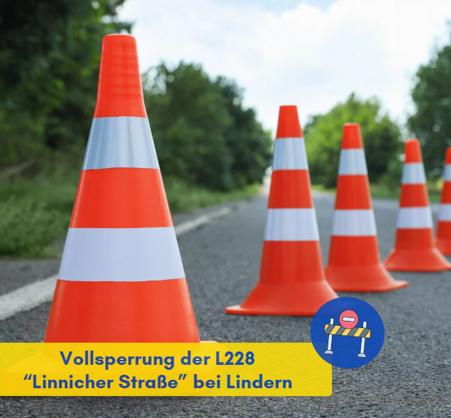 Eine großräumige Umleitung wird ausgeschildert. Sie führt über die L364 „Im Tiefenkamp/Alter Steinweg“ in Richtung Brachelen, weiter über die K15 „Rischmühlenstraße“ nach Linnich und von dort über die L228 wieder nach Lindern und umgekehrt.
