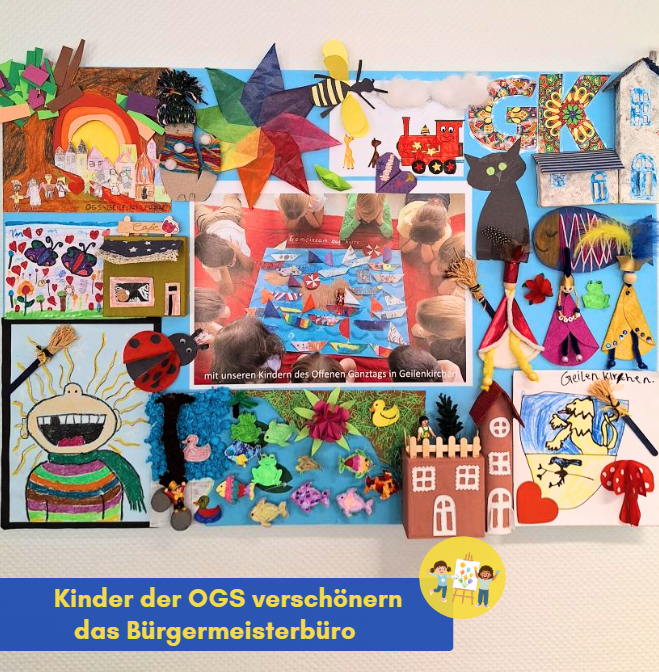 Seit Freitag, dem 23.01.2026, schmückt dieses wunderschöne Kunstwerk das Bürgermeisterbüro. Entstanden ist es in einem Gemeinschaftsprojekt aller Kinder des Offenen Ganztags in Geilenkirchen – bunt, kreativ und mit ganz viel Herz