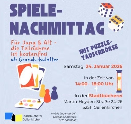Am Samstag, 24. Januar, von 14-18 Uhr lädt die Stadtbücherei Geilenkirchen gemeinsam mit dem Team der Mobilen Jugendarbeit zum 2. offenen Spielenachmittag ein.
