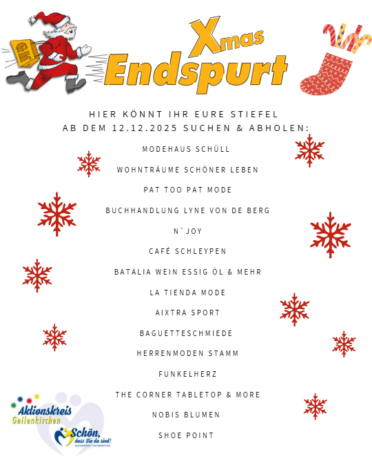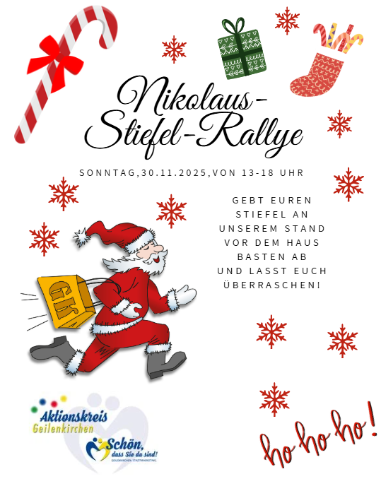 Auch in diesem Jahr lädt das Stadtmarketing Geilenkirchen zur beliebten Stiefel-Rallye ein. Alle Kinder sind herzlich eingeladen, sich eine kleine Weihnachtsüberraschung abzuholen.