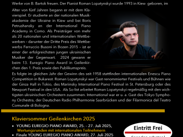 Der Pianist Roman Lopatynskyi wurde 1993 in Kiew geboren, im Alter von fünf Jahren begann er mit dem Klavierspiel. Er studierte an der nationalen Musikakademie der Ukraine in Kiew und bei Boris Petrushansky an der International Piano Academy in Como. Als Preisträger von mehr als 20 nationalen und internationalen Wettbewerben – darunter der Dritte Preis des Wettbewerbs Ferruccio Busoni in Bozen 2015 – ist er einer der erfolgreichsten jungen ukrainischen Musiker der Gegenwart.