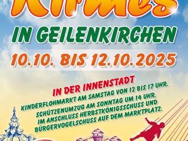 Vom 11.10. bis 13.10.2024 veranstaltet die Stadt Geilenkirchen zusammen mit den drei Schützenbruderschaften der Innenstadt wieder die traditionelle Geilenkirchener Herbstkirmes. Einige Fahrgeschäfte sowie Randgeschäfte wie Schießwagen, Entenangeln, Ballwerfen und Verkaufsstände laden zum bunten Treiben ein. Für das leibliche Wohl sorgen wiederum verschiedene Voll- bzw. Spezialimbisse und Ausschankbetriebe. Die Herbstkirmes wird am Freitag, 11.10.2024, 18.30 Uhr mit einem Fassanstich durch die Bürgermeisterin Daniela Ritzerfeld feierlich eröffnet.