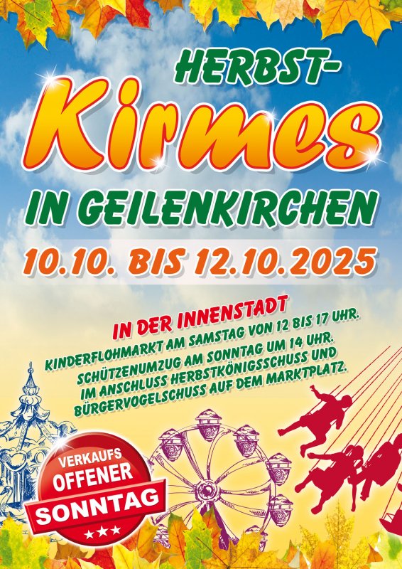 Vom 10. bis 12. Oktober 2025 lädt die Stadt Geilenkirchen gemeinsam mit den drei Schützenbruderschaften der Innenstadt herzlich zur Herbstkirmes für die ganze Familie ein. Auf dem Marktplatz und in der Innenstadt erwarten die Besucherinnen und Besucher traditionelle Fahrgeschäfte, beliebte Spielstände wie Entenangeln oder Schießwagen sowie zahlreiche Verkaufsstände. Für das leibliche Wohl ist ebenfalls bestens gesorgt: Ein vielfältiges kulinarisches Angebot mit Imbiss- und Getränkeständen garantiert Genuss und Abwechslung.