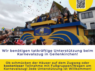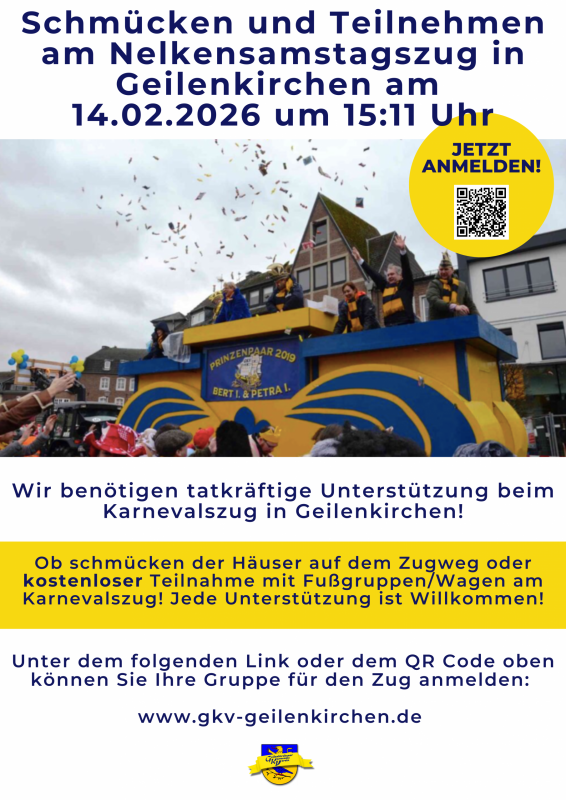 Wir freuen uns über zahlreiche Teilnehmende im Zug als Fussgruppe oder auf dem Wagen. Anmeldungen unter www.gkv-geilenkirchen.de und freut euch auf viele strahlende Gesichter am Straßenrand. Alternativ genießt den bunten Zug vom Straßenrand. Wir freuen uns über geschmückte Häuser entlang des Zugweges.