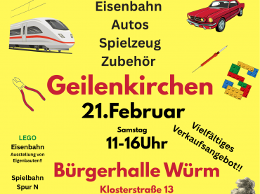 Veranstaltungen Schäfer in der Bürgerhalle Würm!! Modellbahn und Spielzeugmarkt Freuen sie sich auf einen Tag mit dem schönsten Hobby der Welt! Von der Modelleisenbahn über Klemmbausteine bis hin zu Brettspiele ist für jeden Familienmitglied etwas dabei. Es sind viele Händler mit toller Ware dabei ob lang gesuchtes Sammlerstück oder das passende Zubehör für die Modelleisenbahnanlage. Für die Gestaltung der Modelleisenbahn ist bestens gesorgt, Hintergrund Bilder in TOP Qualität in den unterschiedlichsten Größen und Motiven, sowie fein detaillierte Bäume, Blumen, Büsche und Figuren. Auch Modellautos in 1:78, 1:43, 1:18 von Matchbox, Siku, Wiking, Brekina oder Dinkytoys Replica sind beim stöbern zu finden. Eine Spielbahn für Kinder in Spur N sowie eine LEGO Eisenbahn Ausstellung von Eigenbauten gibt es neben der Eggerbahn zu bestaunen. Aus Verbundenheit an Historischem Interesse, zeigen wir eine kleine Bildausstellung von Helmut Hoffmann, Kraftverkehr Erkelenz Omnibusse. Um den Samstag ganz gemütlich zu machen, bieten wir unser hausgemachtes Catering an. Ein deftiges Frikadellenbrötchen, heißer Eintopf oder ein leckeres Stück Kuchen zum guten Kaffee wir das Leibliche Wohl wird gut gesorgt. Wir freuen und über ihren Besuch!! Der Eintritt beträgt 4€ Kinder und Jugendliche bis 14 Jahre in Begleitung eines zahlenden Erwachsenen FREI